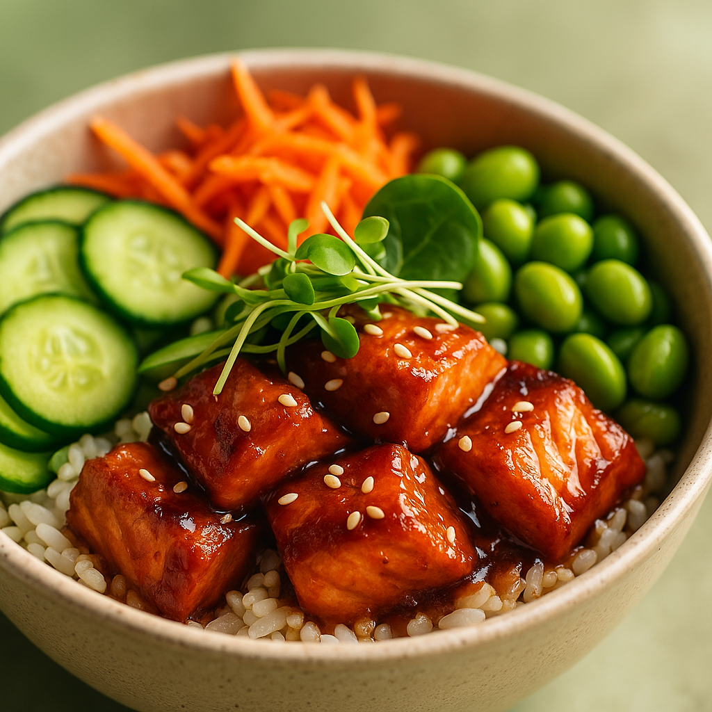 Riz vinaigré, saumon snacké, légumes croquants, sauce poke